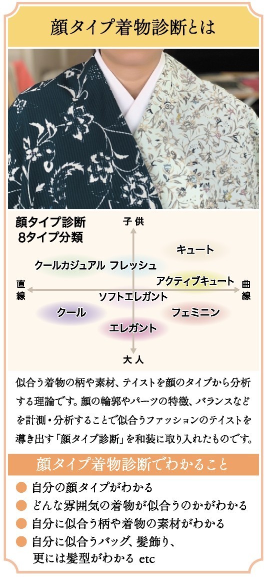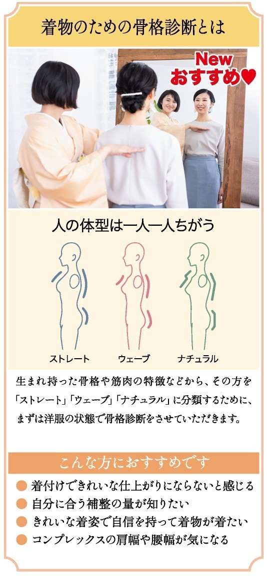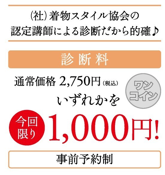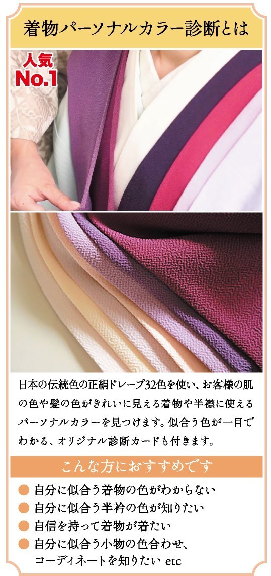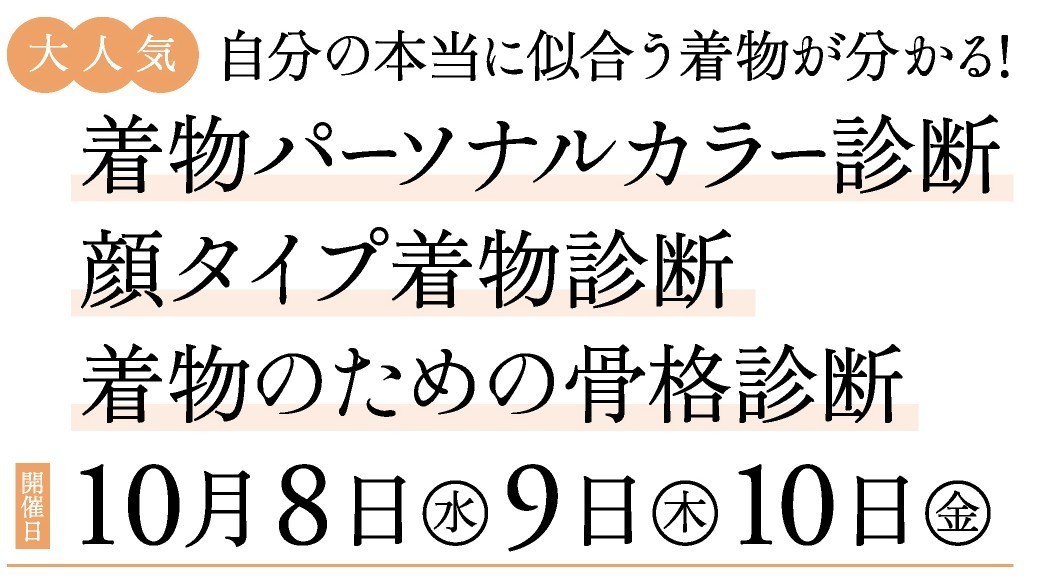 この度の大創業祭にて、アンコールの声が多かった着物パーソナルカラー診断と顔タイプ診断に加え、今回新たに骨格診断も提供いたします。さらに美しい着物の着こなしが出来るようになる3つの診断。ぜひご活用ください。