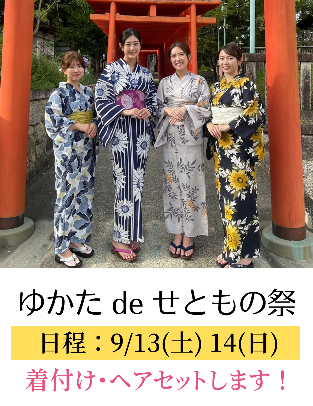 この時期はまだ夏の陽気なので、浴衣でお祭りを楽しめたらという方が多いです。そこで、当店が浴衣の着付けサービスをします。ご希望の方にはヘアセットもいたします。